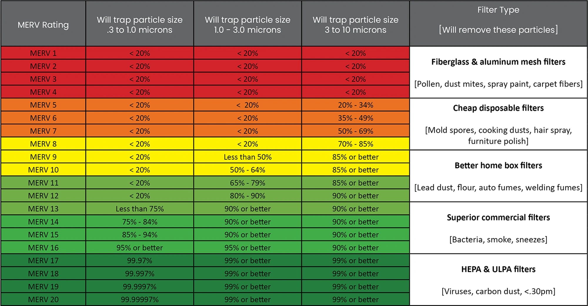 Minimum Efficiency Reporting Values (MERV) reports an air filters ability to capture larger particles between 0.3 and 10 microns (µm). This value is helpful in comparing the performance of different filters. The higher the MERV rating the better the filter is at trapping specific types of particles.